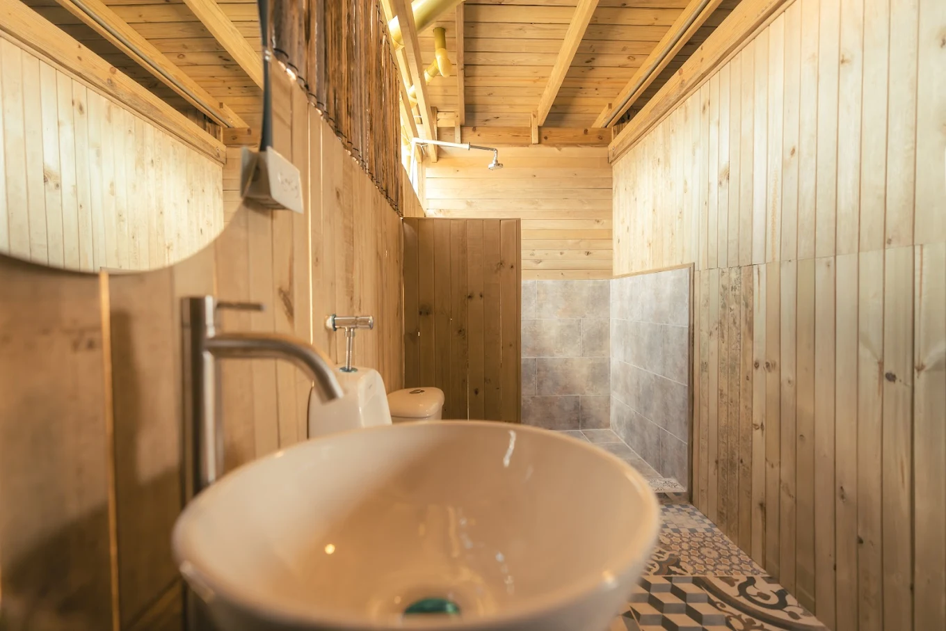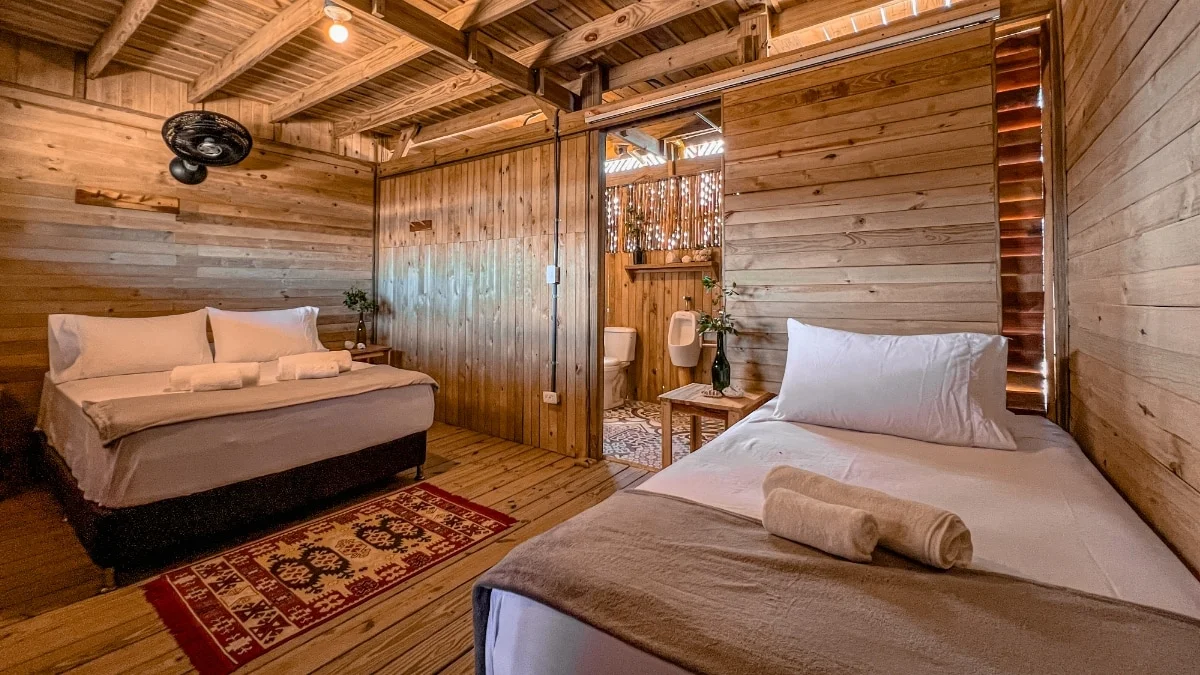 Cocon intime et fonctionnel pour 1 ou 2 personnes, avec lit queen size, salle de bain privée avec douche fraîche, ventilateur et petit balcon jardin. Idéale pour les solos ou duo qui veulent un repos simple, frais et sans chichis mais confortable.